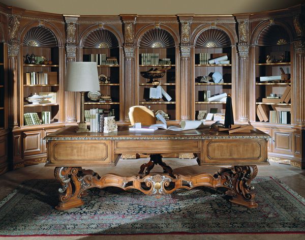 Тоже роскошный, но более светлый дизайн. Показывает соревнование деятелей искусства эпохи Ренессанса. Отсюда – тщательно продуманная гамма оттенков, объемный декор, в том числе витые колонны. Стены покрываются шелкографией, венецианской штукатуркой. В почете библиотеки и атрибуты наук: глобусы, раритетные карты. Для декора выбираются копии работ итальянских мастеров XIV-XVI веков, муранское стекло.
