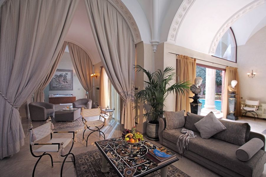 - Декор – вазы с мифическими сюжетами, античные статуэтки.