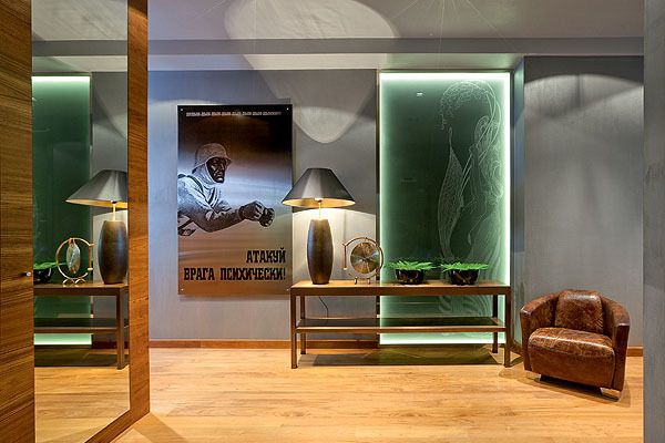 Брутальный военный стиль помещений. Камуфляжная сетка, парусина, лен, цвета хаки, болотный, горчичный – в дизайн квартиры включается все, что ассоциируется с жизнью военных. В том числе и роскошная мебель из кабинетов офицеров. Акценты: военные карты, портреты и бюсты известных деятелей.