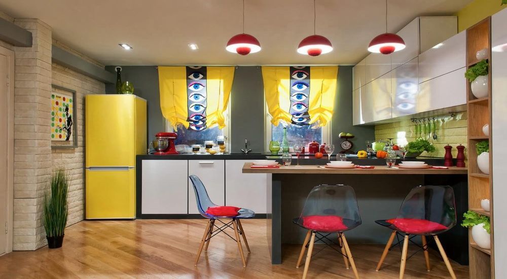Мебель также подбирается ярких цветов. Приветствуется асимметрия в построение планировки, расстановки мебели, оформлении.