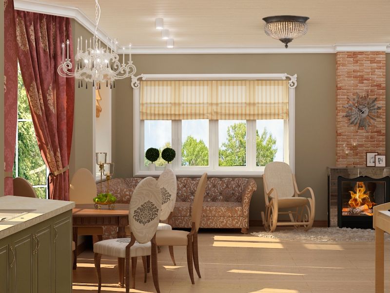 Название стиля говорит само за себя: бело-синие интерьеры с включением характерной росписи. Чтобы дизайн смотрелся хорошо, гжельские мотивы используются только как акцент: посуда на кухне, камин, стилизованный под русскую печь с гжельскими изразцами. Стены стилизуются под деревенский дом или окрашиваются в нейтральные тона. На полу тоже дерево или характерная керамика. Кованые светильники, фарфоровые фигурки и кружево логично завершат композицию.