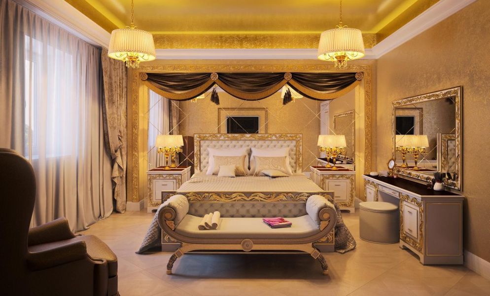 Тоже роскошный, но более светлый дизайн. Показывает соревнование деятелей искусства эпохи Ренессанса. Отсюда – тщательно продуманная гамма оттенков, объемный декор, в том числе витые колонны. Стены покрываются шелкографией, венецианской штукатуркой. В почете библиотеки и атрибуты наук: глобусы, раритетные карты. Для декора выбираются копии работ итальянских мастеров XIV-XVI веков, муранское стекло.
