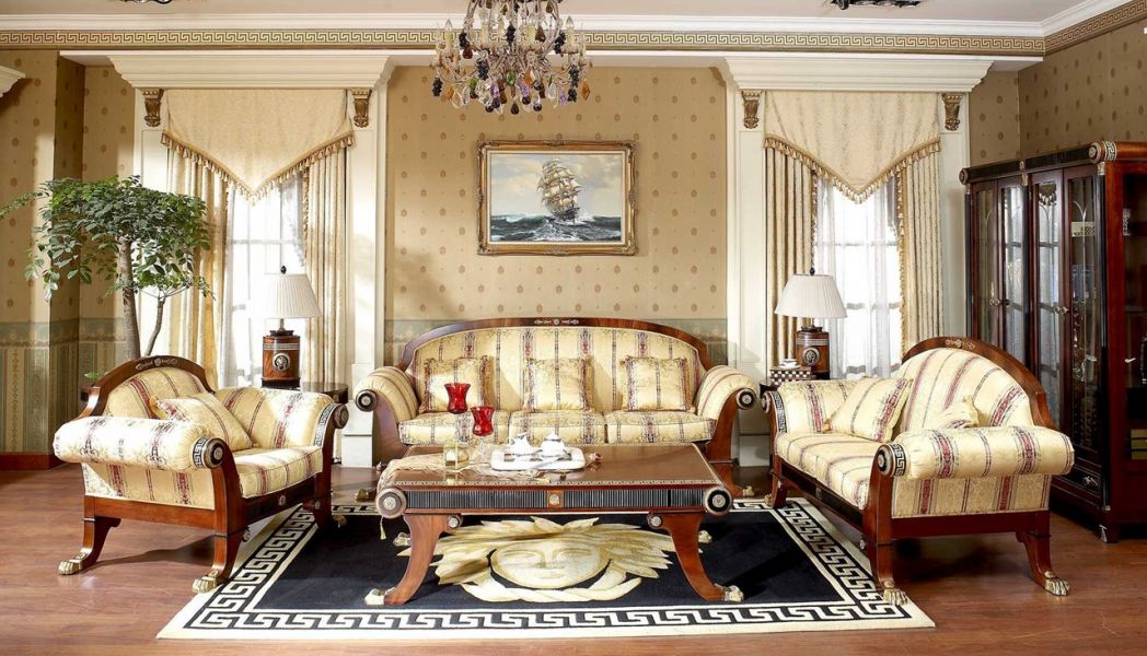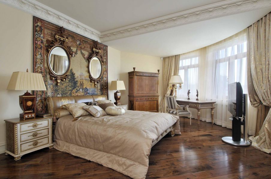 Возник на рубеже XVII-XIX веков как ознаменование победы французской армии. Пышный стиль с дорогими тканями, массивной мебелью и светильниками, обилием орнаментов. Интерьер помещения категорически не терпит искусственные материалы. Для ампира нужны квартиры с высокими потолками и просторными комнатами, иначе роскошь превратит дизайн в фарс. Палитра: белый, золото, бронза, сапфир, цвета драгоценных камней. Декор – лепнина, гобелены, инкрустации, резьба на предметах мебели.