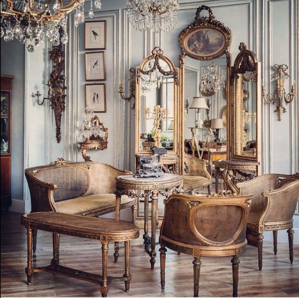 Интерьер европейских монархов. В основе стиля лежат принципы барокко. Каждый объект обстановки и декора должен иметь историю, поэтому стиль подойдет антикварам. Основные краски – бирюза, серебро, жемчужные оттенки. Полы оформляются деревом или авторским ламинатом с соответствующей текстурой. Среди предметов мебели должен быть секретер, вольтеровское кресло, софа. Декор дорогой, но не такой обильный, как в барокко: полупрозрачный текстиль, слоновая кость, хрусталь, оникс.