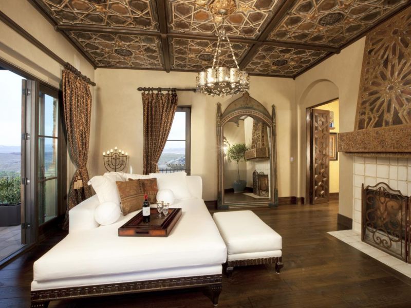 Интерьеры, построенные на типичных арабских орнаментах и контрастных цветах. Композиция обстановки строится на европейских принципах.