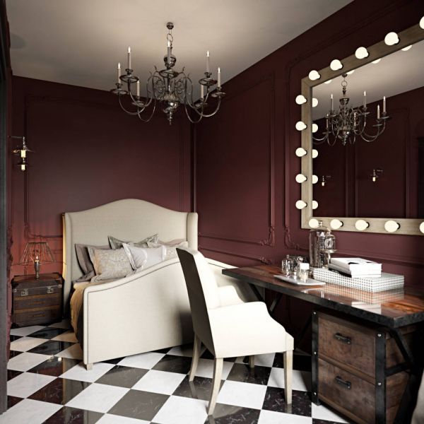 Мебель в стиле «Честерфилд» и старомодные предметы – основа дизайна. Свет неяркий, люстру дополнят двухрожковые бра. Декор составляют безделушки, расставленные на многочисленных полках. Темный бурый и вишневый разбавят миндальный и лавандовый оттенки.