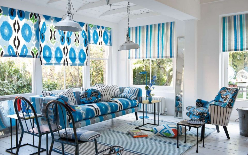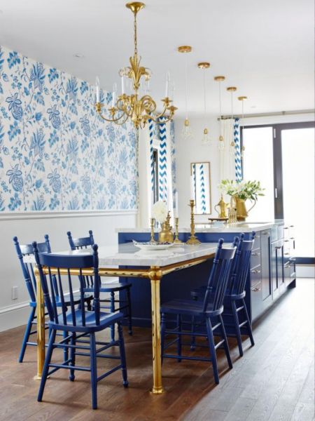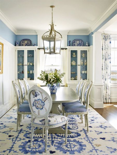- Палитра светлая, преобладают белый и голубые оттенки. Акценты расставляются ярким кобальтовым и зеленым в сочетании с золотом.