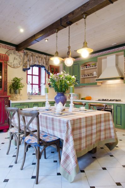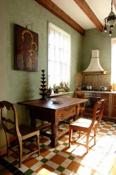 Сочетание кантри и русской избы. Натуральные материалы, орнаментальная, но грубоватая керамика, нарочито грубая мебель, подчеркнутая брутальность.