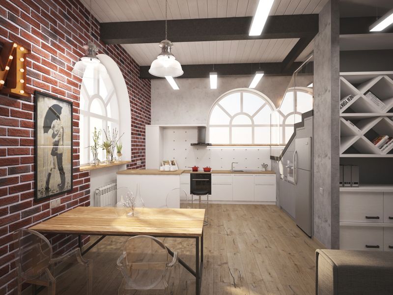 Лофт в самом жестком его виде. Стиль строится на массивности деталей, иногда даже преувеличении. Потолок помещения подкреплен крупными балками, коммуникации выставлены напоказ. В приоритете кирпич, бетон, металл.