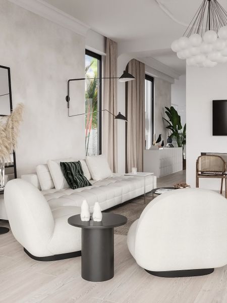 Светлые монохромные интерьеры с функциональной, эргономичной мебелью. Сдержанный декор, мягкий теплый текстиль. Можно использовать акценты в виде одеял пэчворк, морских неярких пейзажей, сухоцветов. Ценится семейная история, поэтому в квартире гармонично смотрятся семейные фото на стенах и полочках.