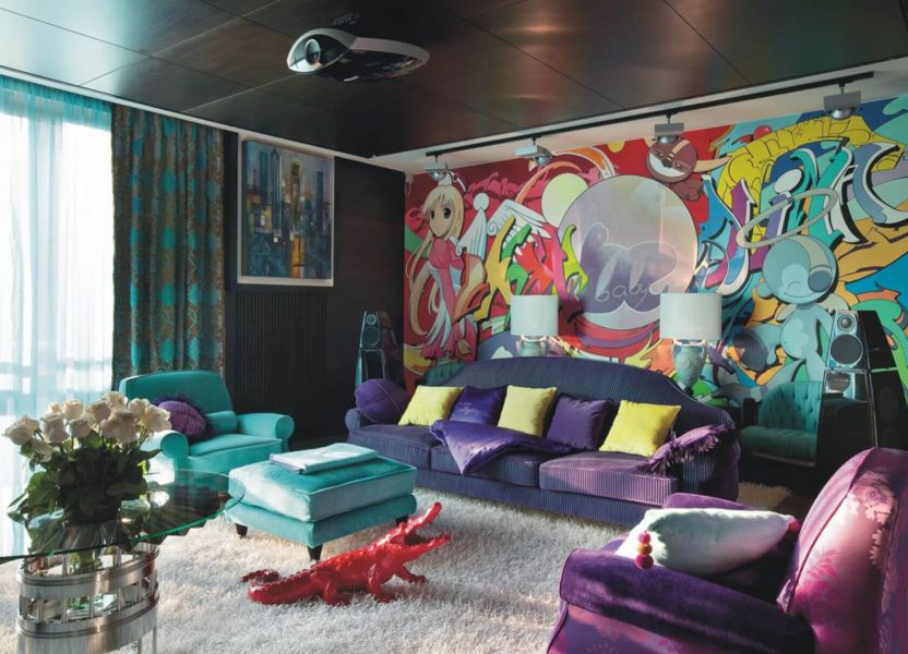 Стиль диско, время джинсы и кислотных оттенков. Неоновая подсветка, портреты звезд эстрады и кино 60-х годов. Кресла-кровати, трансформеры, кожаные пуфы, низкие столики – обстановка для тусовки. Колорит помещению придает мебель, которую, кажется, впору выбросить. Фасады вручную окрашены ядовитыми неоновыми цветами. Вряд ли можно спокойно жить, если всю квартиру оформить в диско-стиле. Лучше оставить его для гостиной зоны.