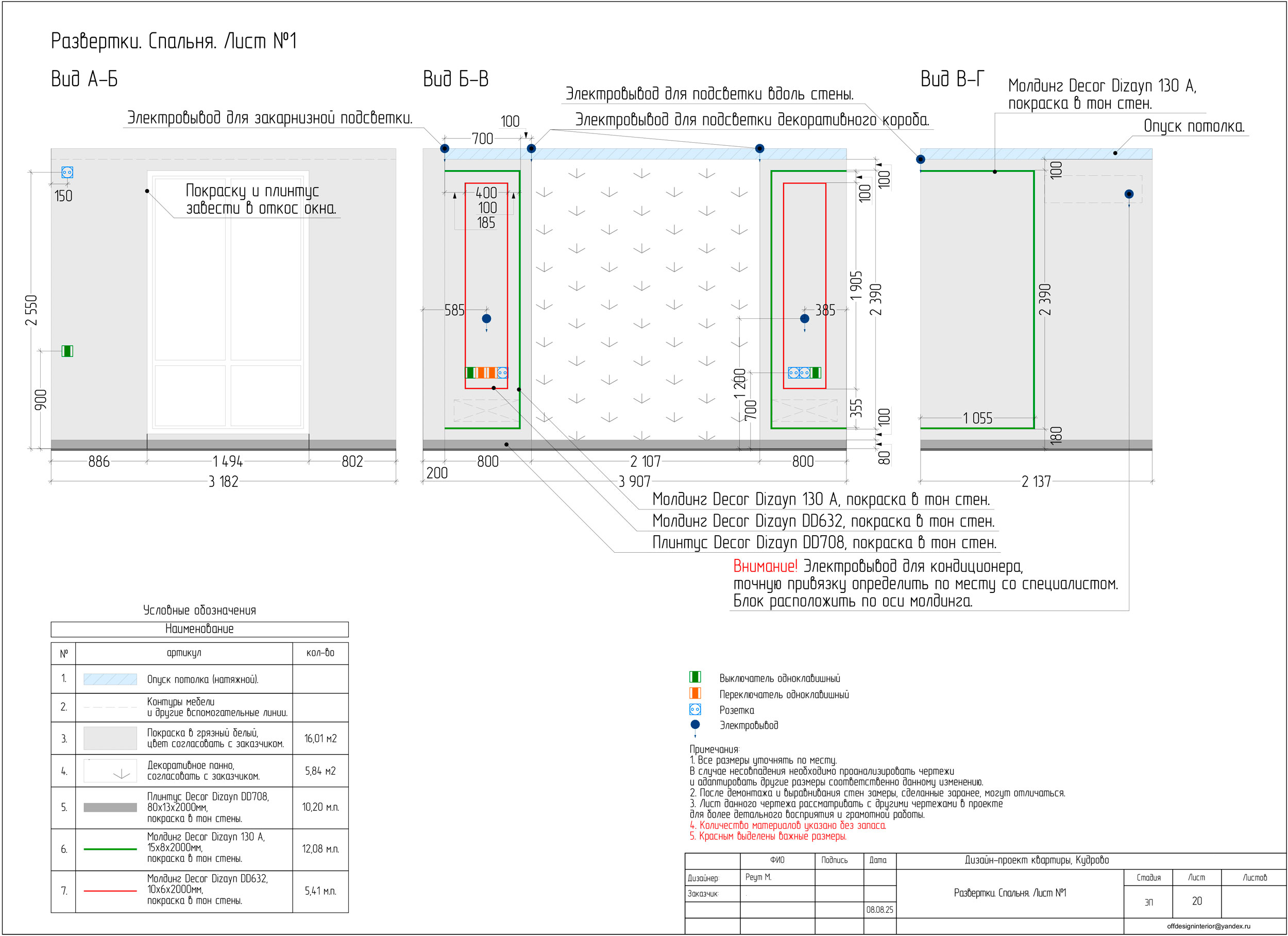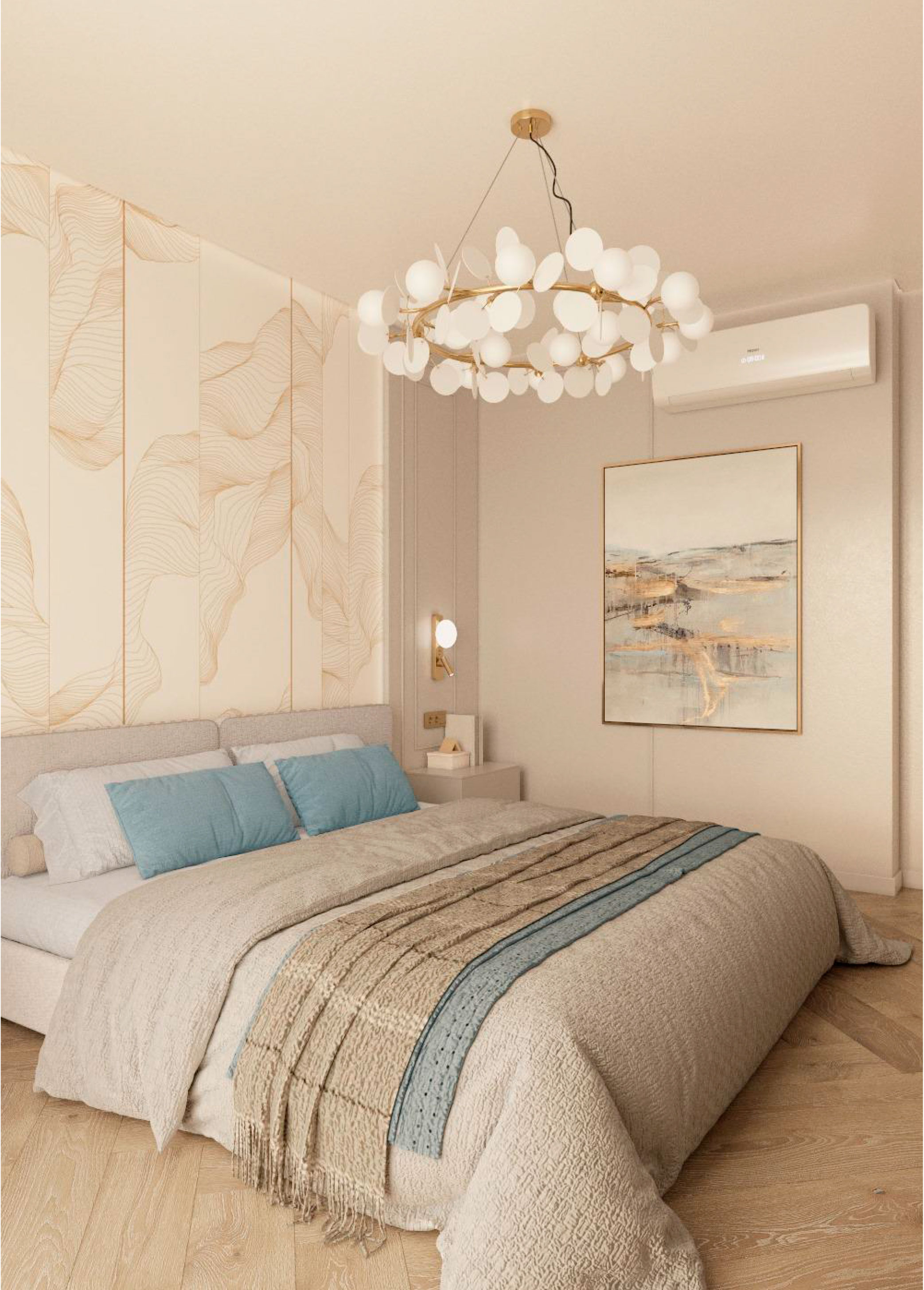 - освещение преимущественно за счет люстры, светодиодная подсветка делает акцент на панно, точечные светильники в зоне рабочего стола, бра у кровати;