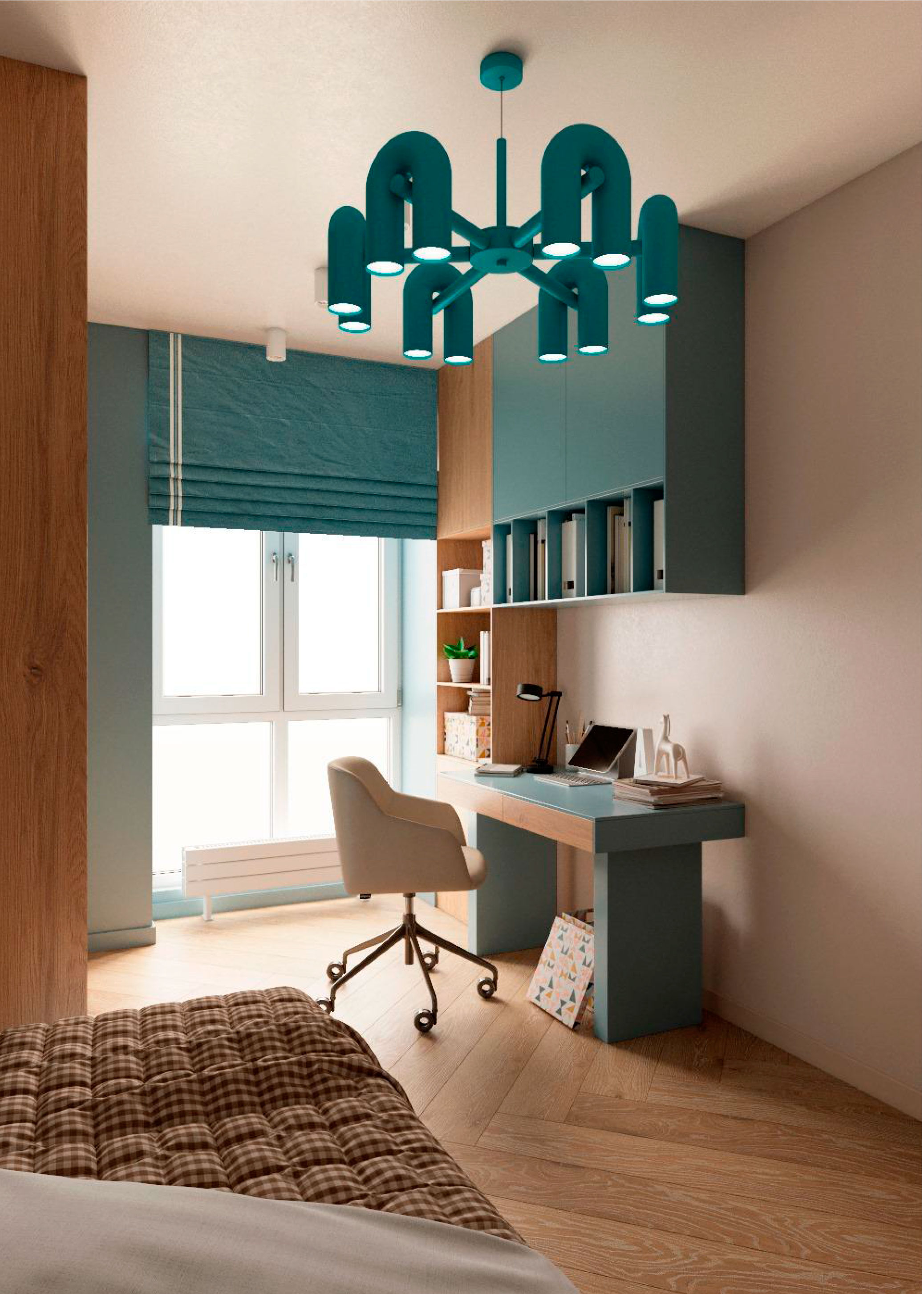 Стилистическое единство подчеркивается за счет бирюзовой мягкой кровати и дизайнерской люстры в том же оттенке. Окно оформили римской шторой в основном цвете комнаты с белым кантом. Плинтус выкрашен в тон примыкающим стенам.